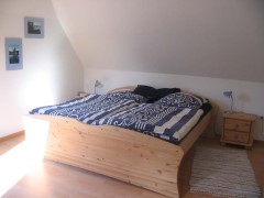 Großzügig und hell ist das Schlafzimmer gestaltet. Und bei schönem Wetter werden Sie von den Sonnenstrahlen geweckt. Ein Kleiderschrank mit Spiegel und eine Kommode bieten Platz für Ihre Urlaubsgaderobe. Das Bett hat 2 Matratzen mit einer Größe von jeweils 90 x 200 cm.